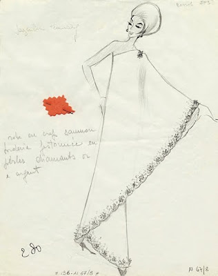 * A la derecha dibujo de V para uno de los vestidos que luciría Jacky Kennedy Onassis y uno de los motivos por los que se hizo diseñador Ziegfeld Girl junto con muchas otras películas de la época.