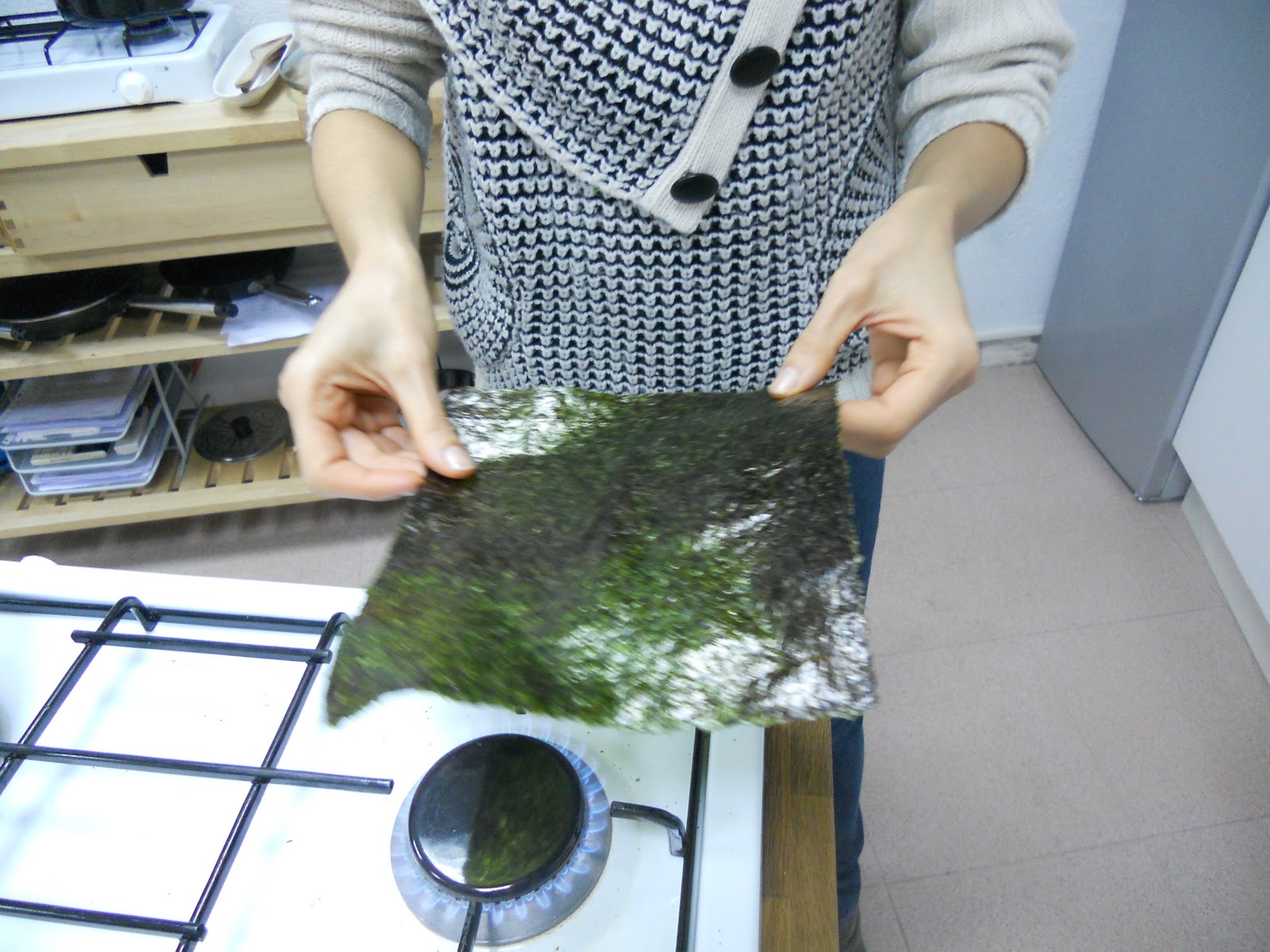 Primero se tuesta el alga por la parte rugosa, alga Nori, como el suavizante del borreguito pero sin T, de Tegucigalpa.
