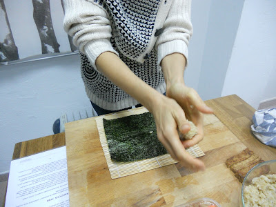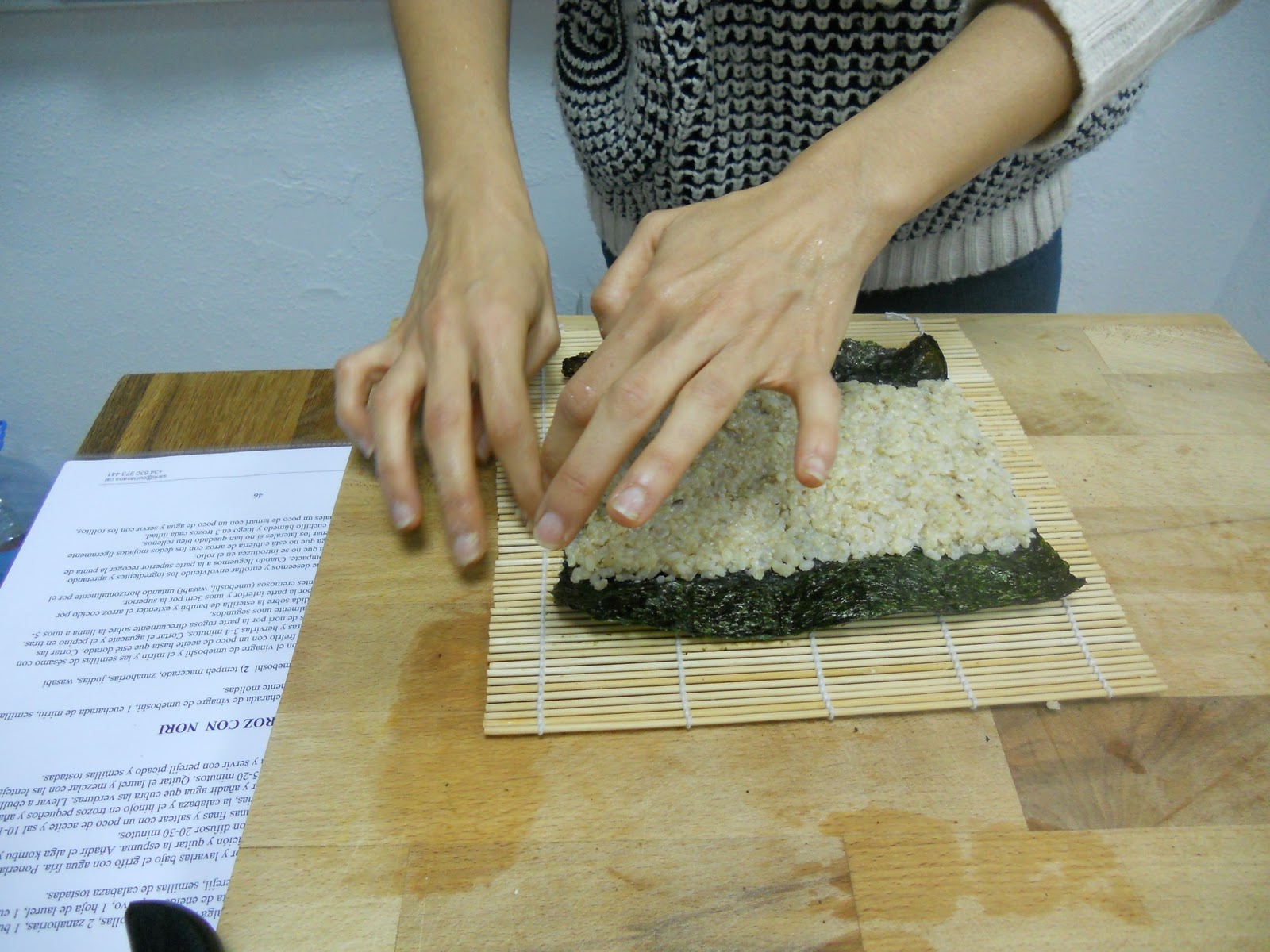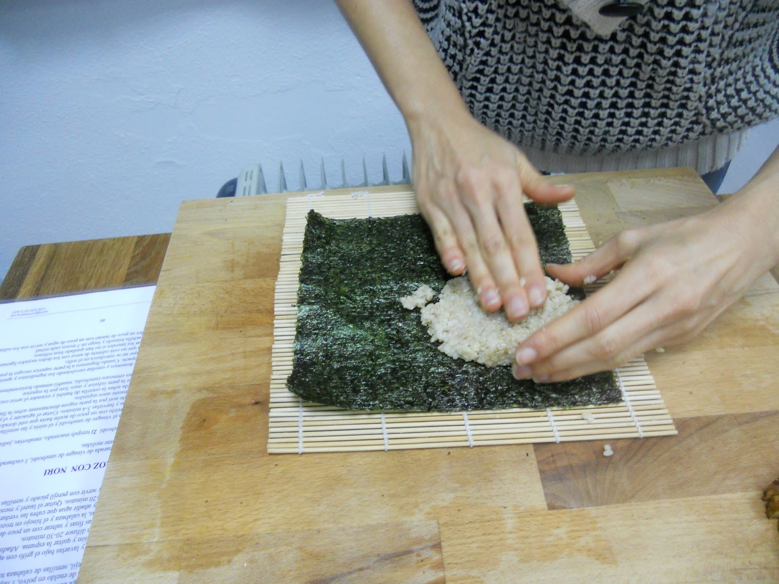 Amasas el arroz con las manos y lo colocas en el alga siemrpre procurando que los bordes queden libres para luego ser mojados con deditos de agua o lagrimas en mi caso de cortar tanta cebolla.